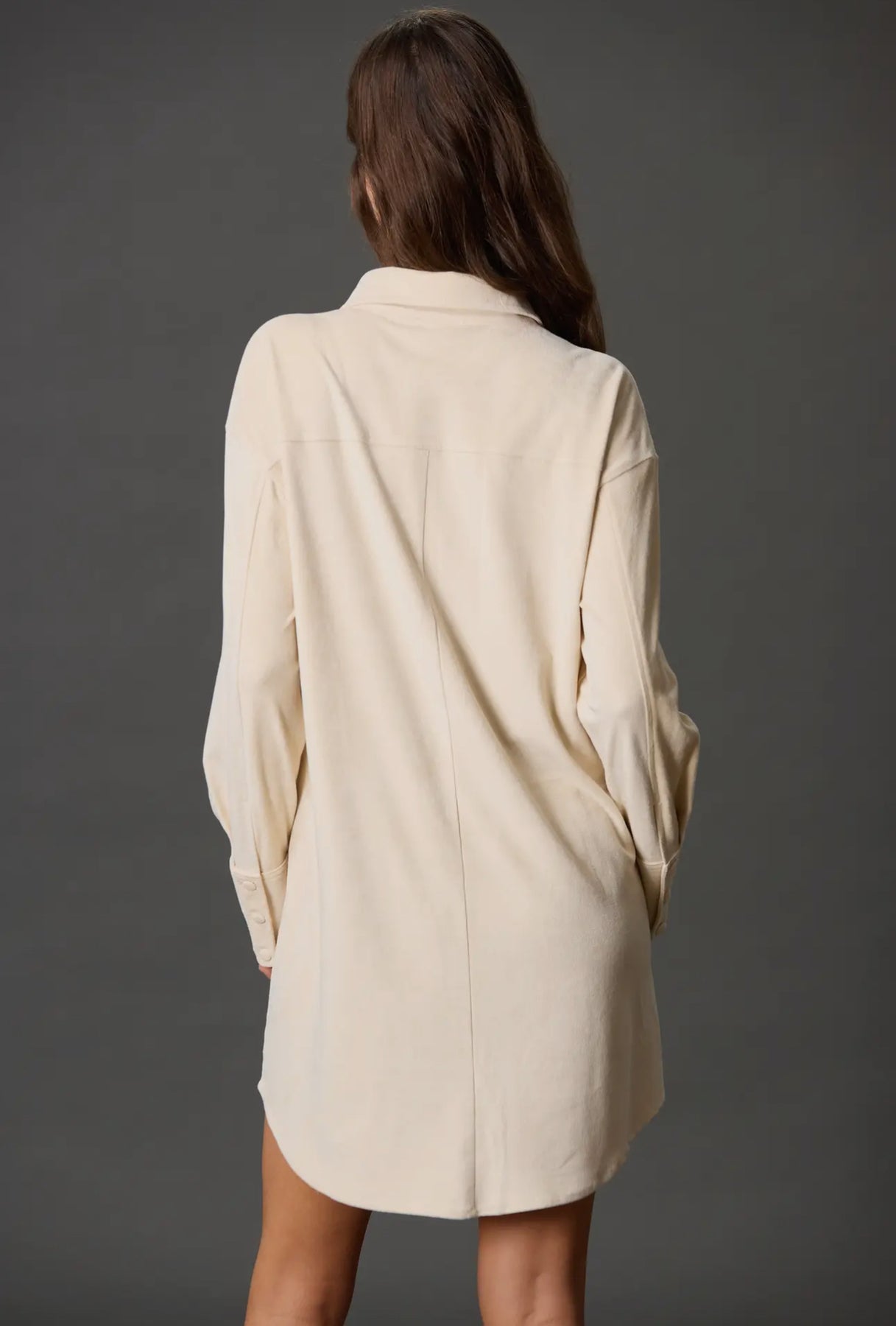 Expertly crafted with soft suede, this long sleeve button down dress in ivory offers both comfort and style. Perfect for any occasion, this versatile dress is a must-have addition to your wardrobe. Feel confident and fashionable in this effortlessly chic piece.