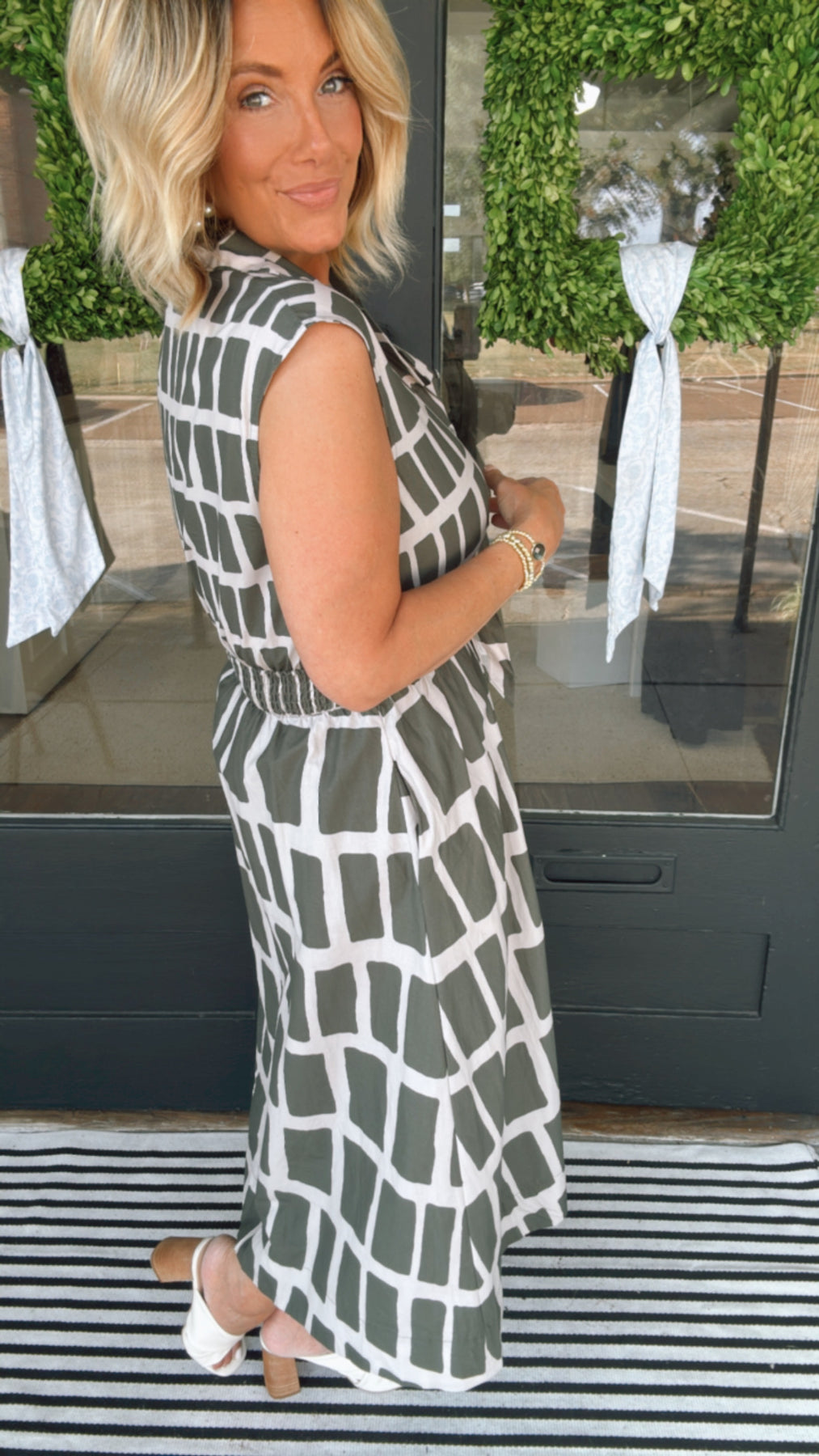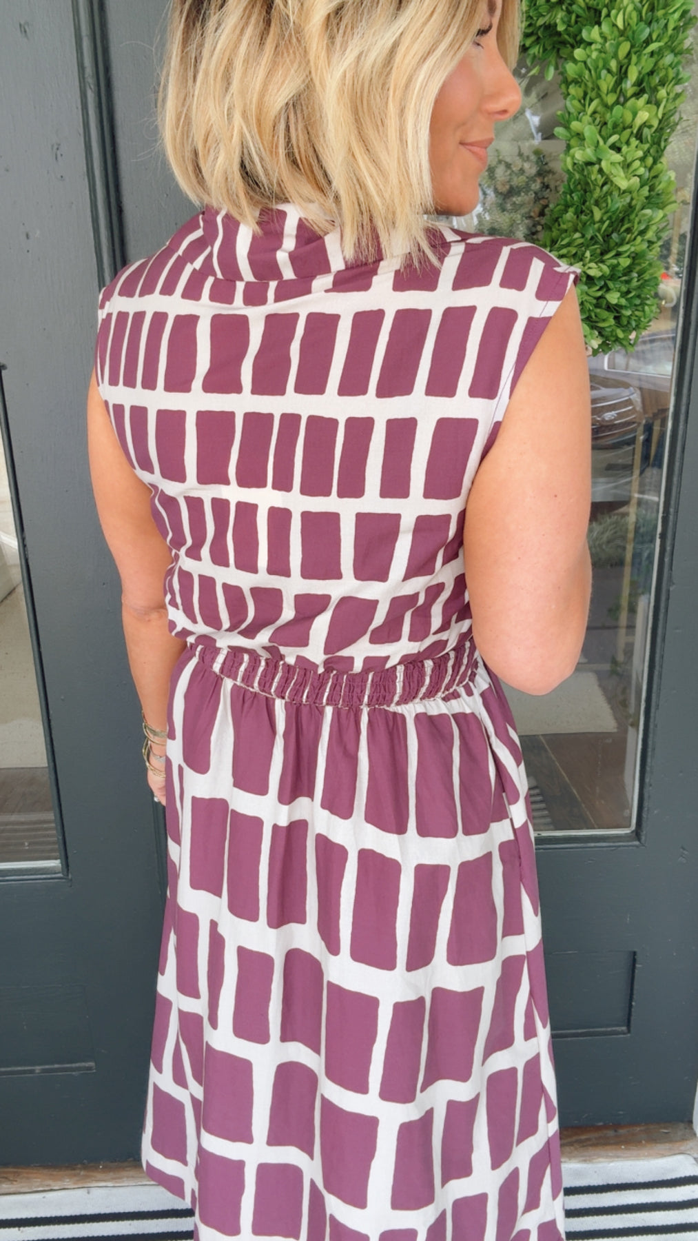 Unleash your inner risk-taker with our Abstract Midi Dress! This sleeveless dress boasts a bold abstract print and a daring collar button front with a knot closure. The smocked back waistband and pockets add practicality to this statement piece. Perfect for any adventure, this lightweight dress comes in two vibrant colors, Wine and Olive.