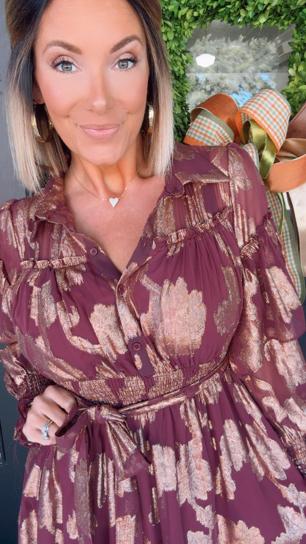 "Step out in bold style with The Mallie Maxi dress! Its metallic maroon and gold design adds a touch of adventure to any occasion. Perfect for holidays and special events, this dress is sure to make a statement. Dress to impress and take a risk with The Mallie Maxi!"