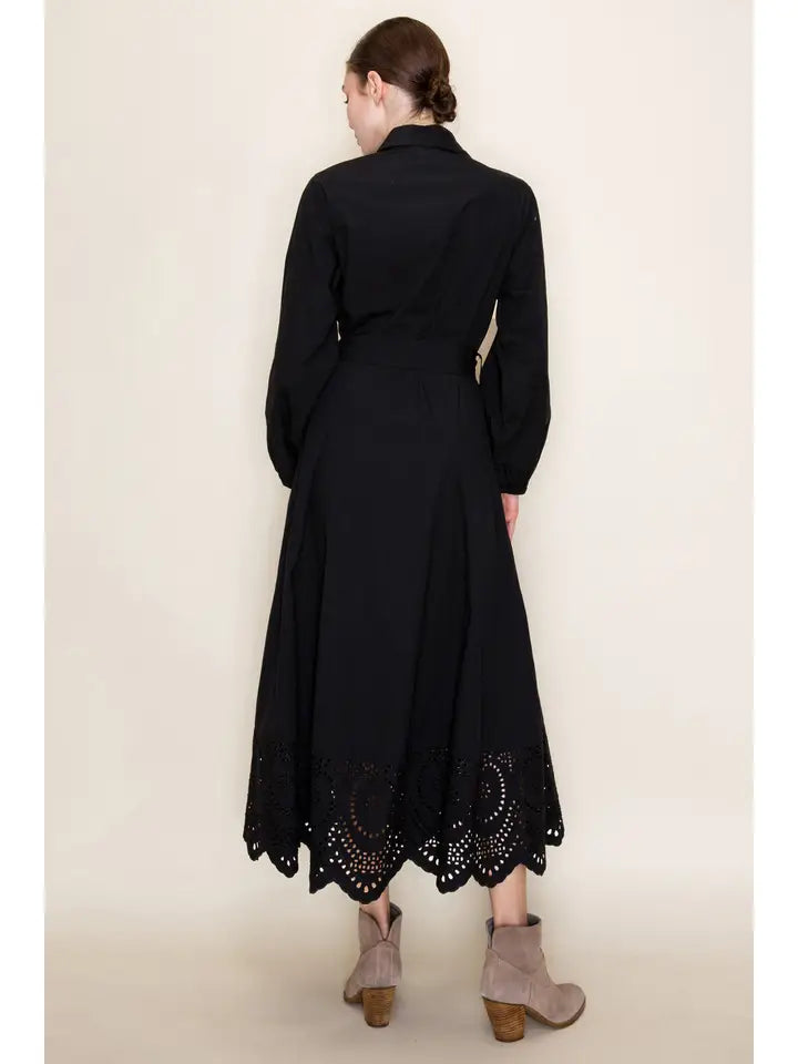The Stephanie Dress dares to redefine everyday elegance with its eyelet fabric and scalloped hemline. Featuring a button-down front and a self-tie waist belt, this maxi shirt dress sculpts your silhouette while adding a touch of bold sophistication. Long sleeves and a classic collar balance the design’s playful edge, making it a standout choice for Fall and Winter wardrobes. Embrace style that’s as confident as you are with this fresh take on contemporary women’s wear.