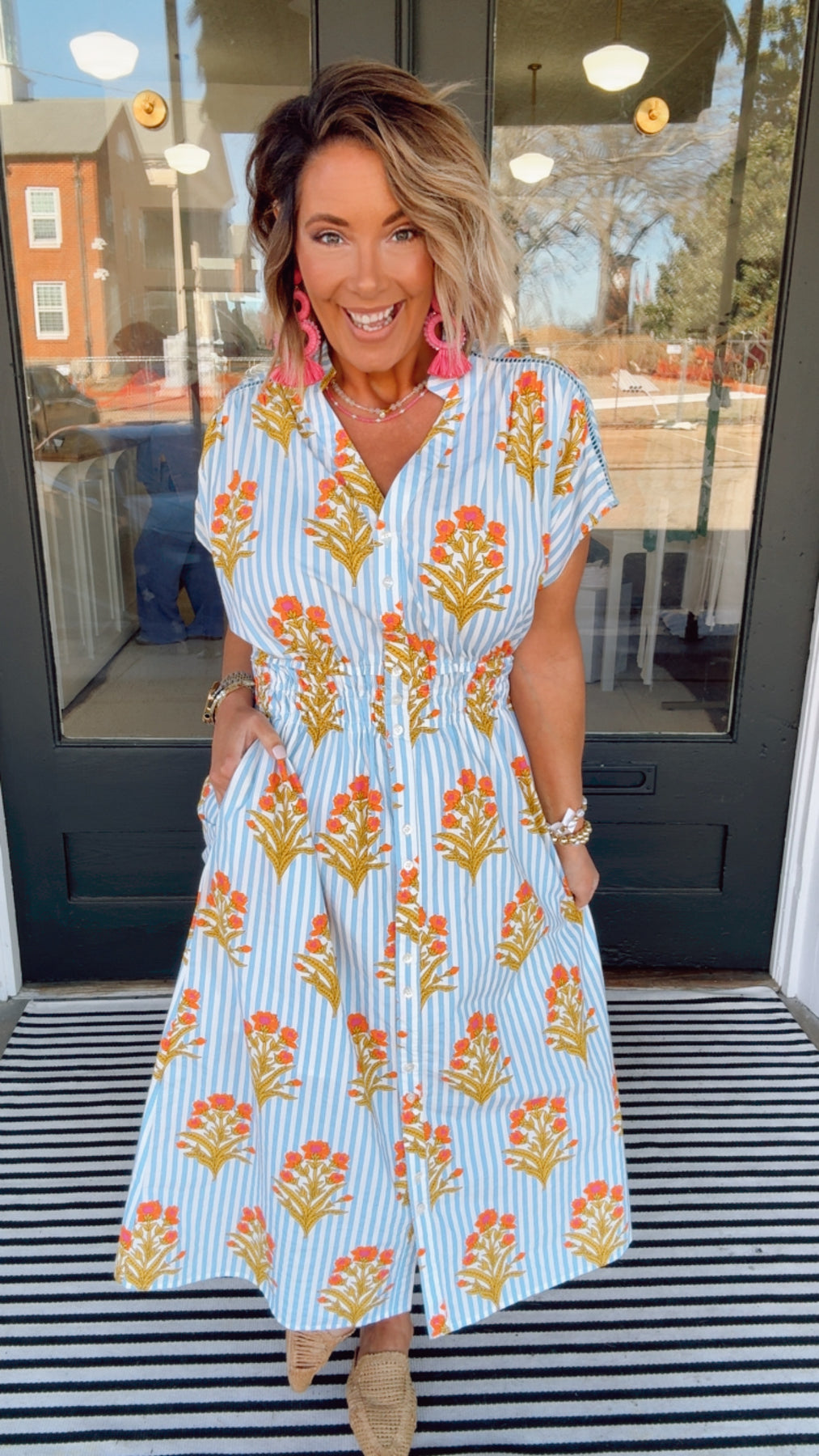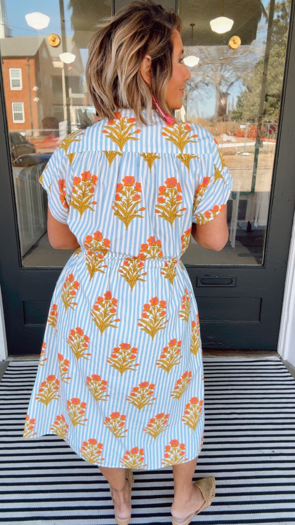 THML Harvest Bloom Dress combines timeless appeal with contemporary flair. This short-sleeve piece features a sophisticated floral striped print that transitions seamlessly from casual daytime wear to evening occasions. The structured design flatters multiple silhouettes while the breathable fabric ensures all-day comfort. Perfect for layering or wearing solo, this versatile dress pairs effortlessly with sneakers, sandals, or heels. A wardrobe essential that delivers both style and practicality for the modern woman.