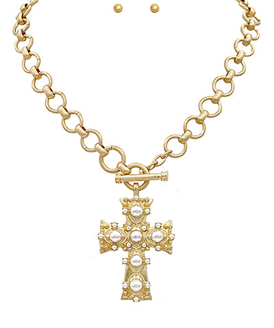 Pearl Studded Cross Necklace Set