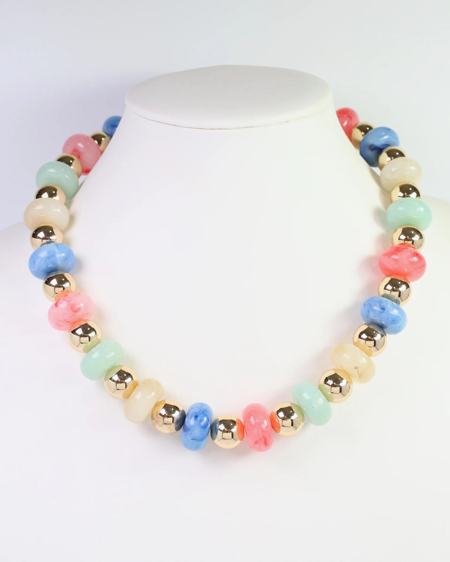 Get ready to turn heads with this playful multi colored marble and gold necklace that's anything but boring. Smooth marble disc beads dance alongside shimmering gold CC beads, creating a fun mix of textures and sparkle. Whether you're dressing up for a night out or adding pizzazz to your casual look, this charming piece brings just the right amount of personality and shine to any outfit.