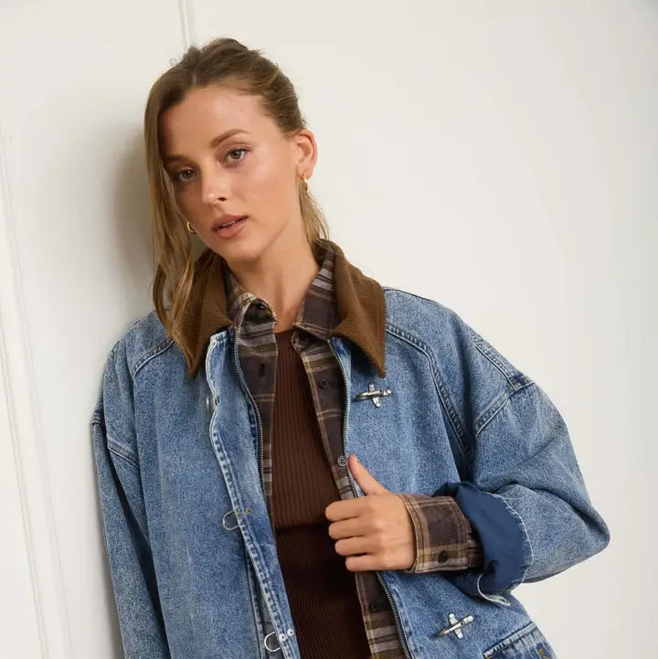 Elevate your outerwear collection with this statement-making denim jacket, crafted from 100% cotton with an acid-washed finish that adds vintage character. The contrast collar frames the face beautifully, while functional latch hook hardware at the front provides both security and visual interest. Long sleeves and a generous long-line silhouette create a flattering, modern fit—perfect for layering or wearing solo. Practical pocket detailing and a fully lined interior ensure comfort and durability through every season. Each piece's unique wash variation guarantees one-of-a-kind appeal.