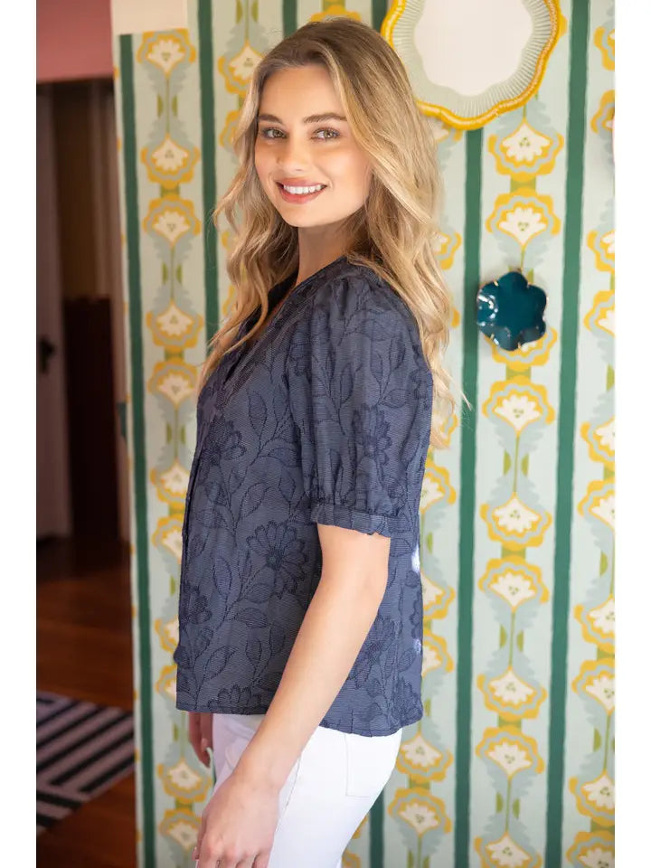 Effortlessly refined, this textured short sleeve top brings understated elegance to your warm-weather wardrobe. The split neckline and voluminous puff sleeves create a polished silhouette, while the button front allows for easy layering and styling versatility. Crafted from lightweight fabric, it's designed for breathable comfort through spring and summer. Perfect for transitioning from casual days to evening occasions with minimal effort.