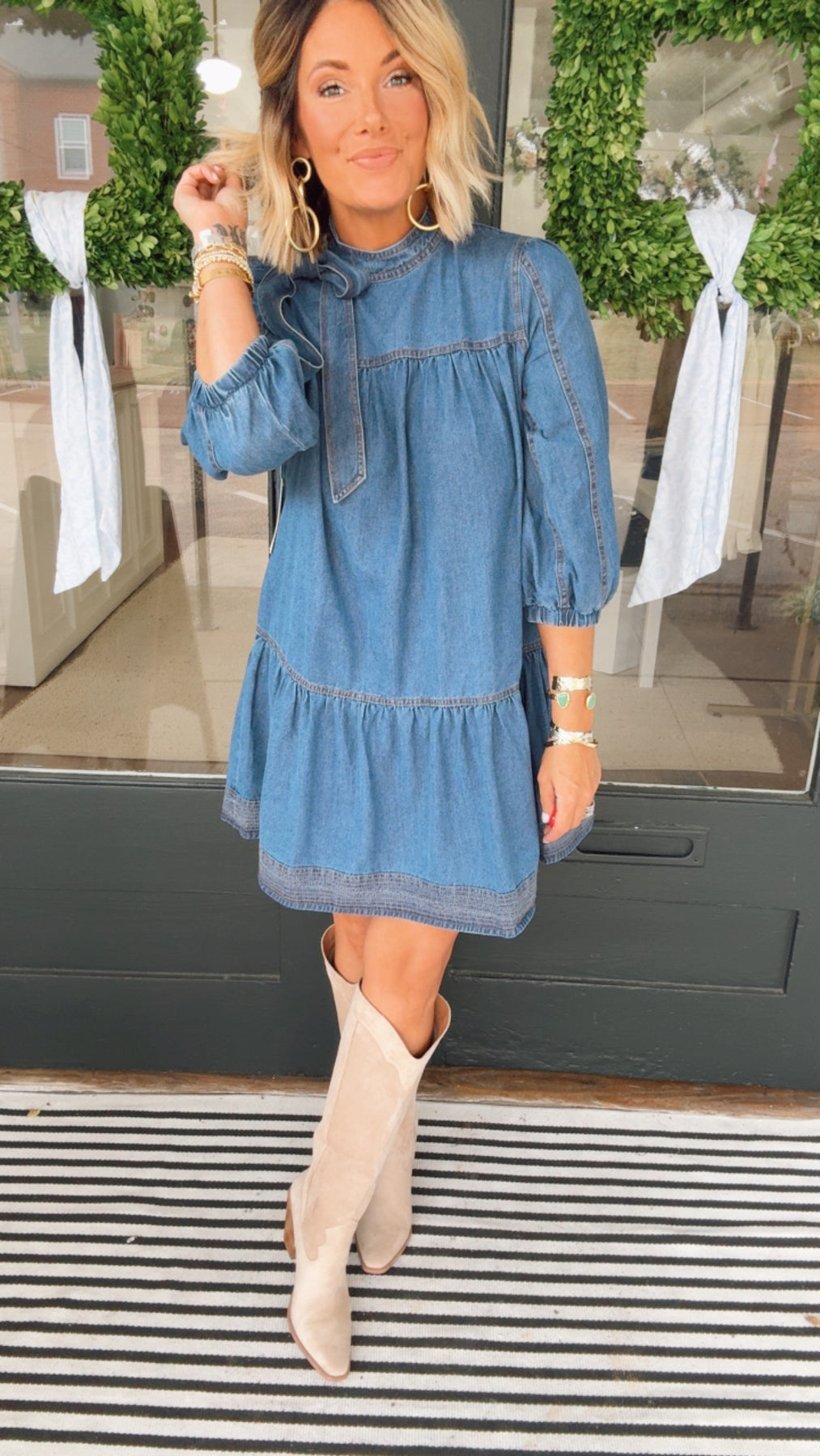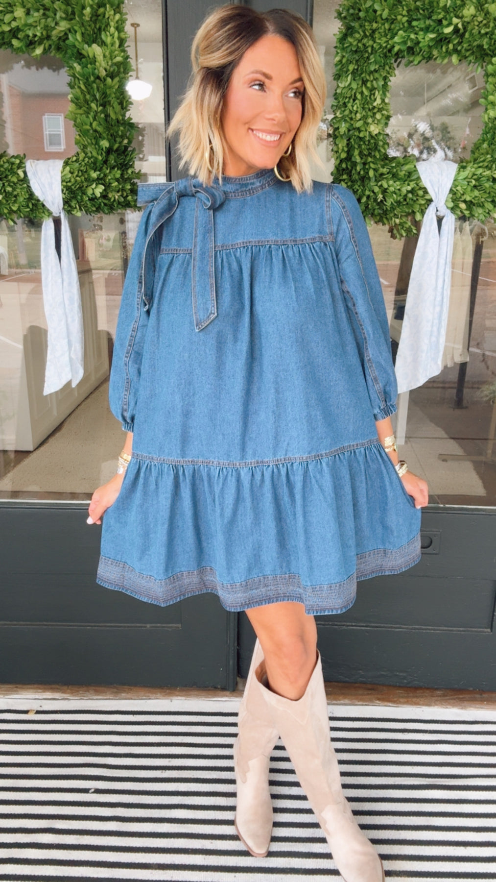 "Rise above the rest in The Darla Denim Dress! The contrasting stitch detail and high neckline add bold style, while the washed denim fabric elevates your adventurous spirit. Complete with a bow tie, this dress is ready for your next risk-taking adventure!"
