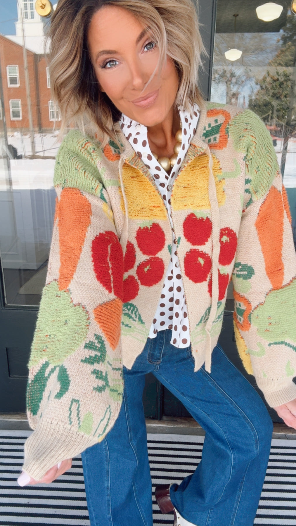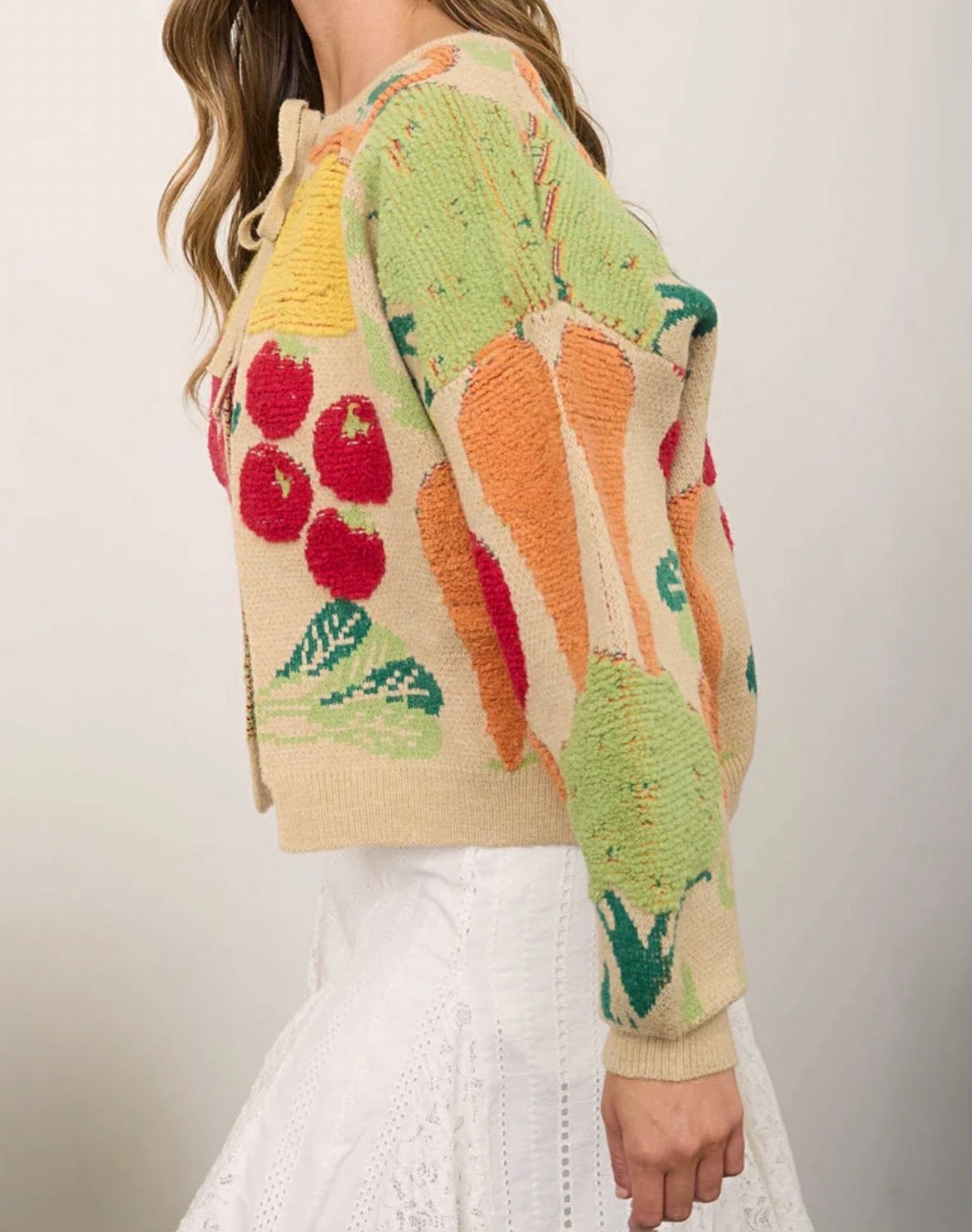 The Farmer's Market Cardigan Embrace your inner gardener with this whimsical cardigan featuring a delightful veggie print scattered across the fabric. From cheerful tomatoes to charming carrots, each playful detail brings a touch of farmers market charm to your everyday wardrobe. Perfect for layering over your favorite tee or dress, this cozy piece celebrates fresh style with a fun, lighthearted spirit. A conversation starter that proves fashion can be both quirky and comfortable.