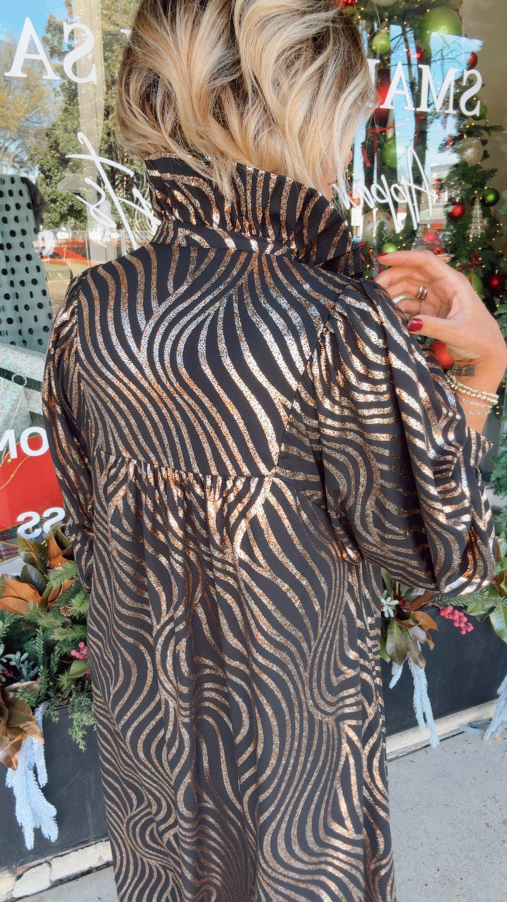 Embrace boldness in the Layla Dress! This stunning maxi dress features a striking combination of gold and black, perfect for making a statement. Take risks and stand out in this daring and beautiful dress, sure to turn heads wherever you go.