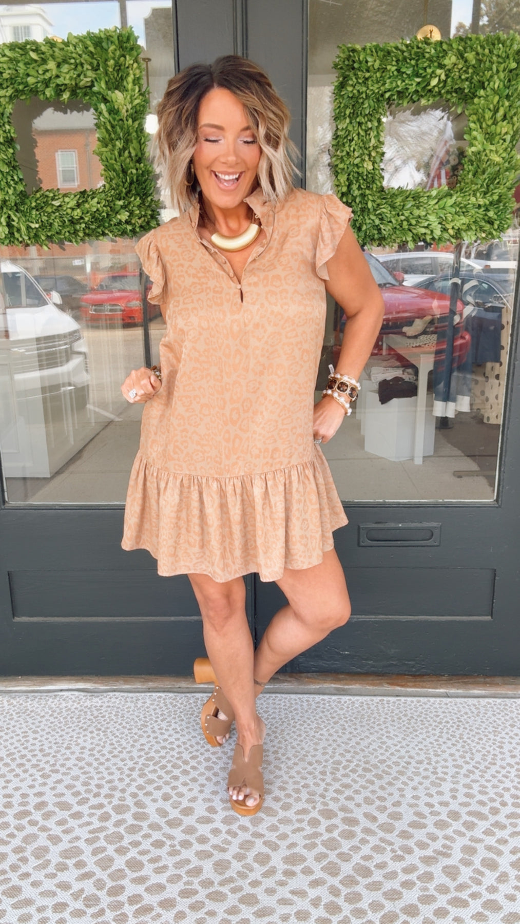 Stay on-trend with this leopard print mini dress, a boutique favorite. This ruffle sleeve babydoll dress features a chic mock neck and tiered hem, perfect for casual or dressed-up looks. A must-have animal print dress for your everyday or boho-inspired collection.
