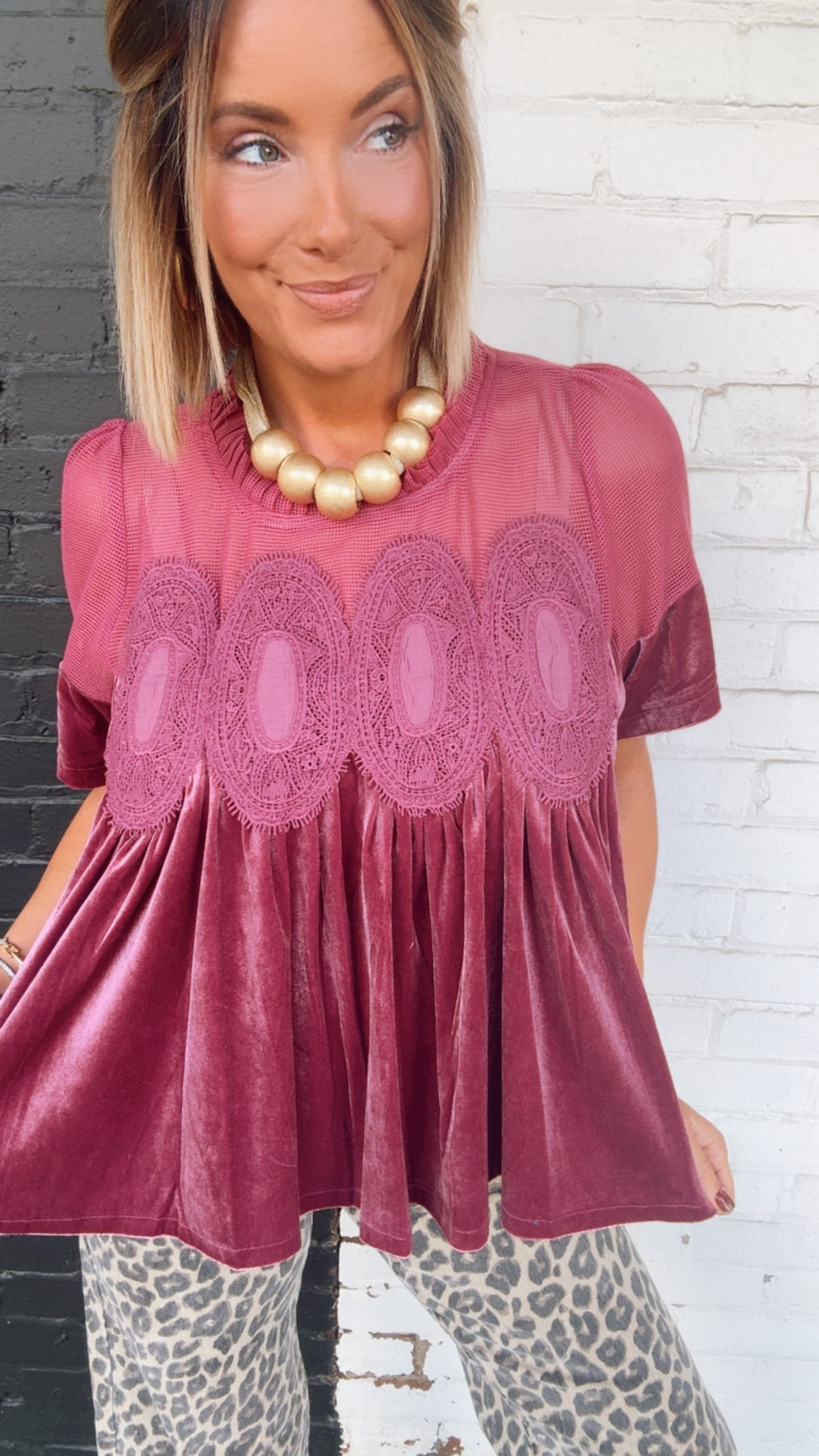 The Olivia Top is your go-to piece for effortless charm. Crafted in sumptuous velvet with delicate lace detailing, this babydoll silhouette flatters every figure while keeping things fun and flirty. Perfect for date night, brunch with friends, or whenever you want to feel a little extra fabulous. Slip it on and let your personality shine.