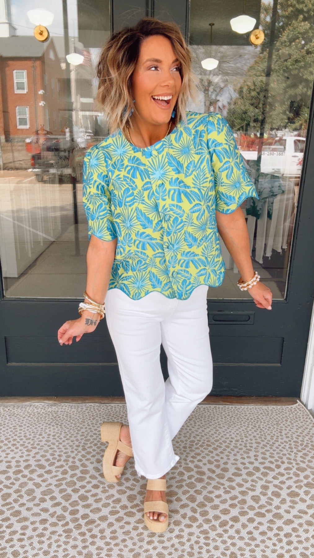 Crafted for women who love standout style, this palm-print top brings bold color and refined details together for a look that feels polished, playful, and undeniably chic.