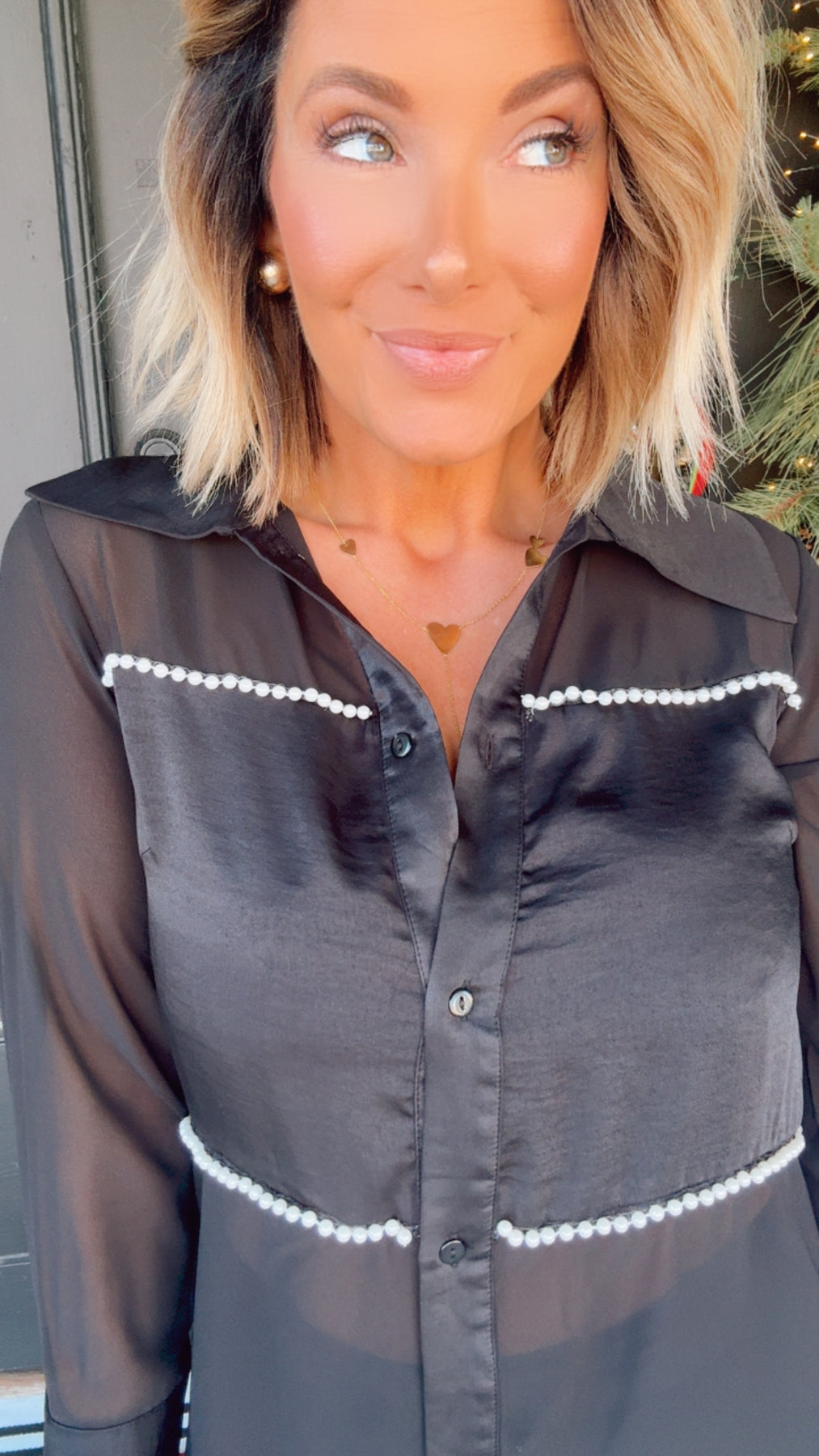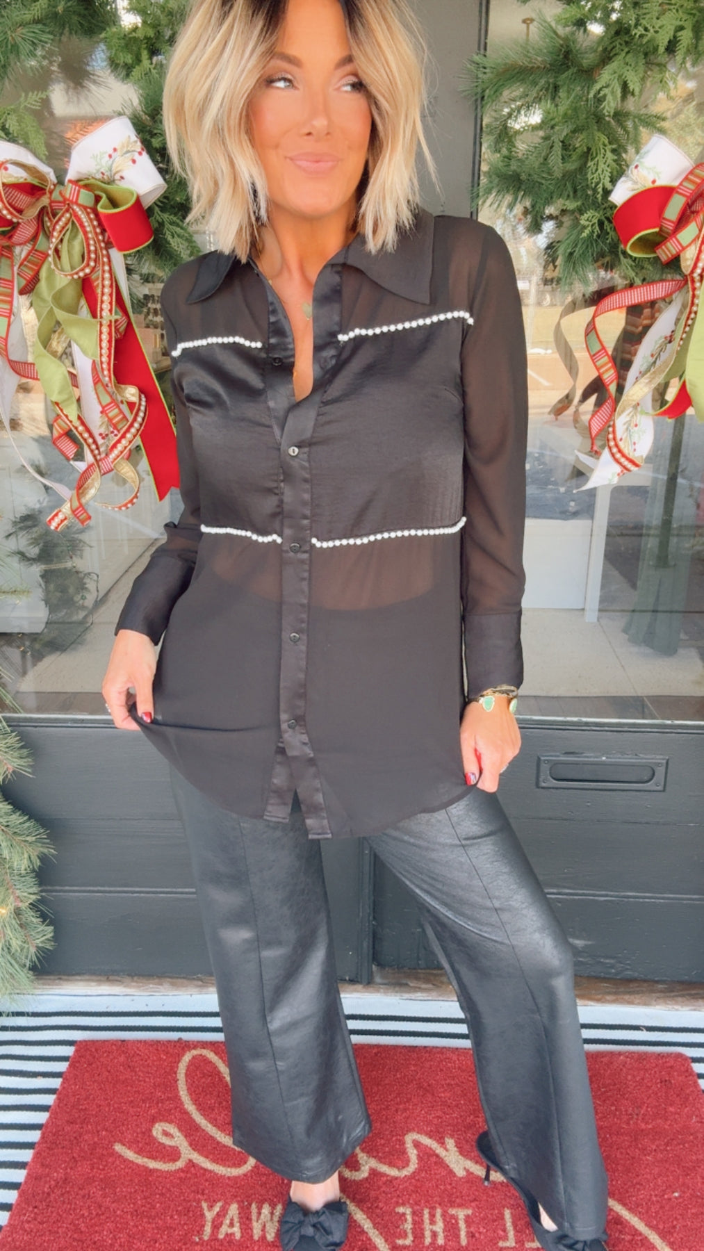 Elevate your wardrobe with the Pearl Embellished Sheer Top, featuring a refined chiffon and satin contrast that adds depth and texture. The delicate faux pearl embellishments bring subtle elegance to the button-up shirt design, while the tunic length offers a graceful silhouette perfect for both work and evening occasions. This top blends classic sophistication with modern details for a polished, timeless look.