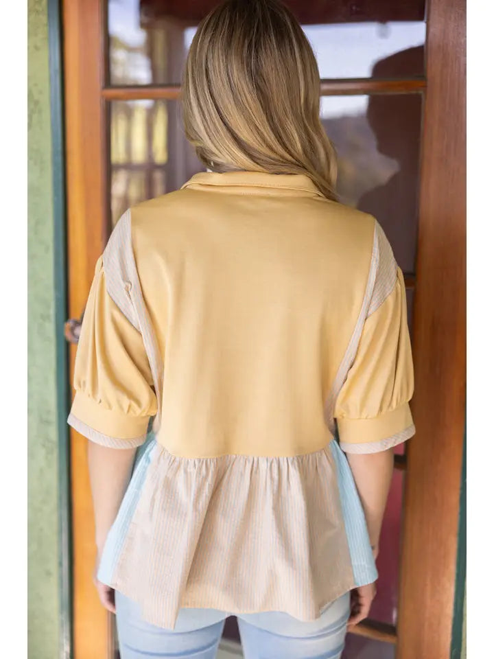 Snap Button Mixed Color Block Peplum Top Mix and match your way to effortless style with this playful peplum top. Bold color blocks create instant visual interest, while functional snap buttons make getting dressed a breeze. The fitted peplum silhouette adds a flirty feminine touch that works equally well dressed up for a night out or paired with your favorite jeans for weekend vibes. A versatile wardrobe essential that brings personality to every outfit.