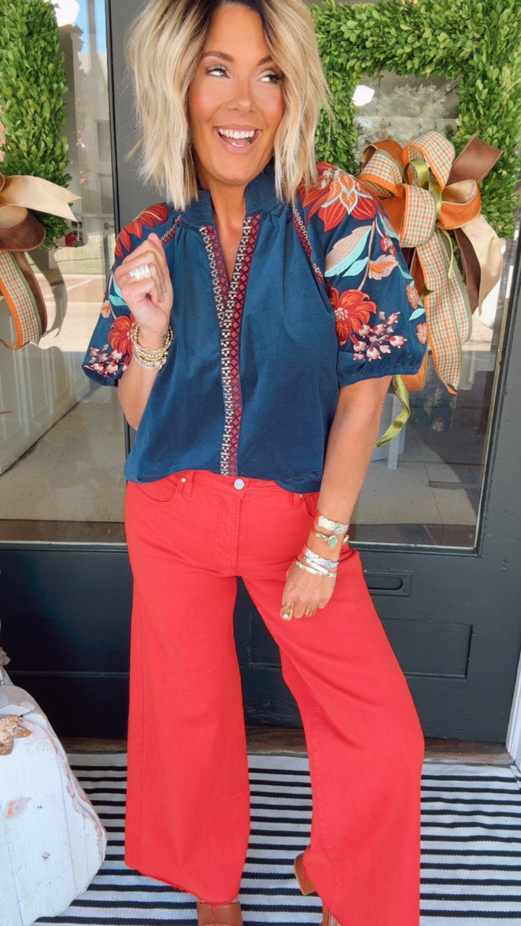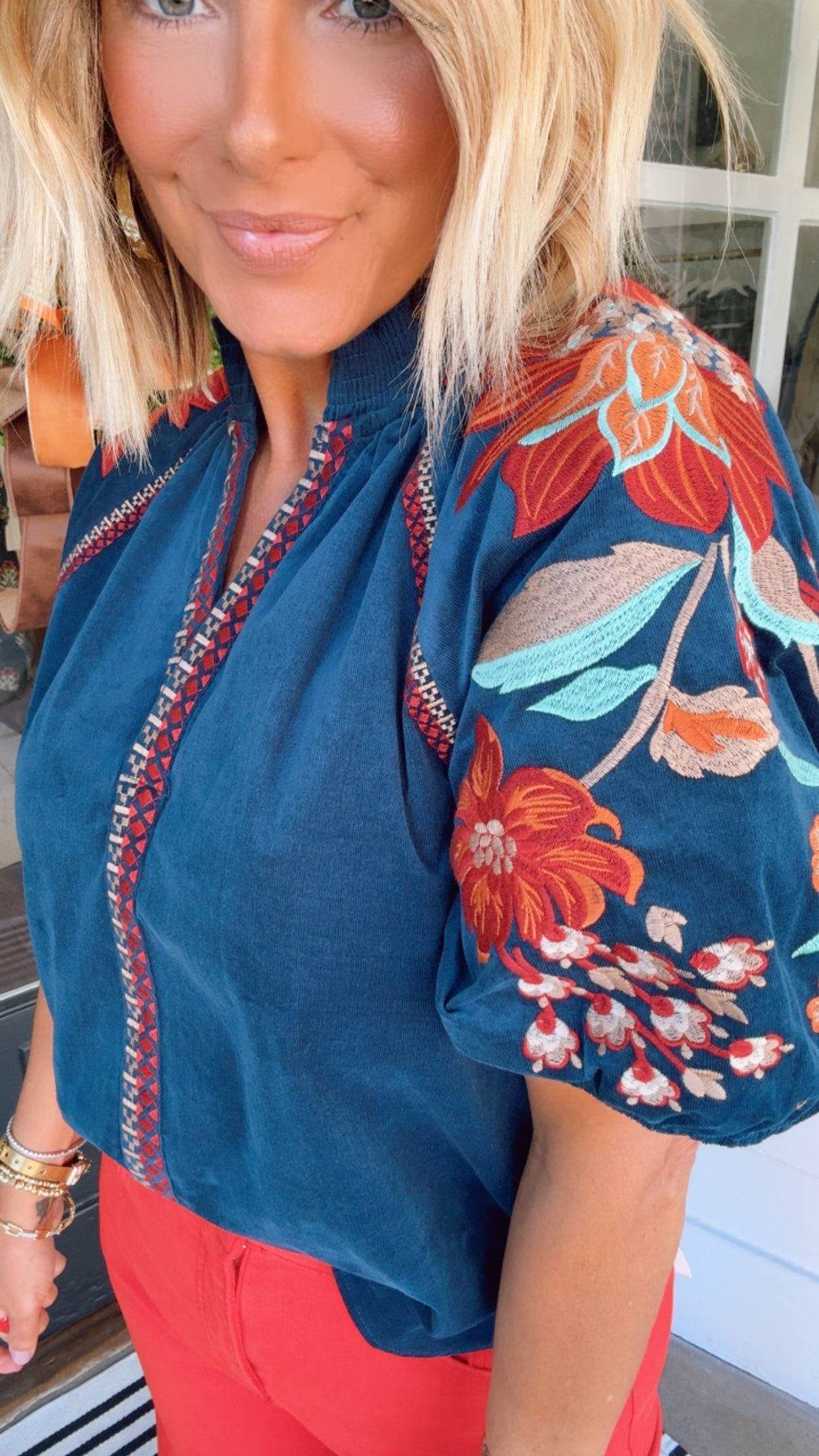 Take on the wild side with the THML Whitney Top. Featuring vibrant floral embroidery and playful puff sleeves, this v-neck top is perfect for adding a touch of adventure to your wardrobe. Stay bold and confident in this statement piece.