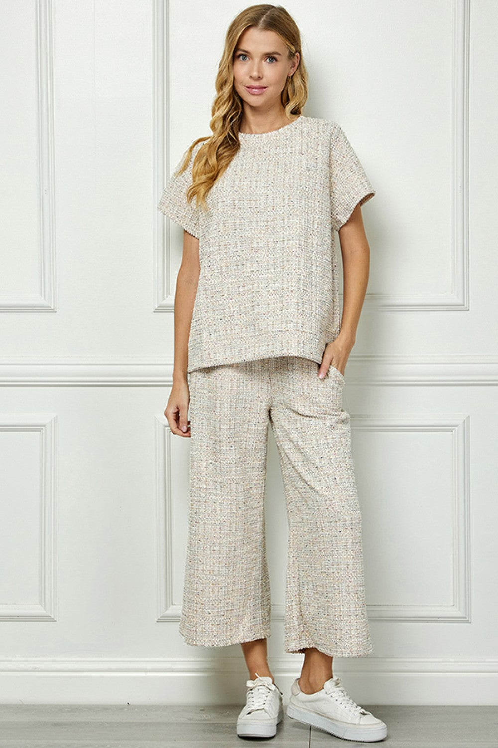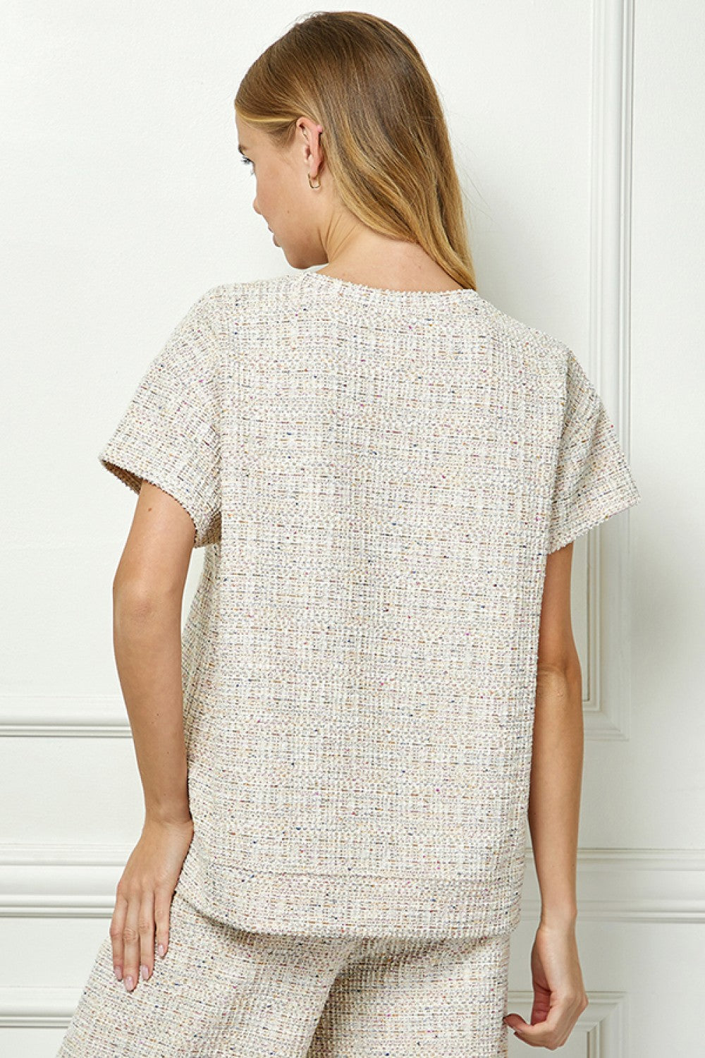 Elevate your everyday look with The Tweedy Set’s Boucle Textured Short Sleeve Top. Crafted from a cozy blend of polyester, wool, cotton, acrylic, and just a touch of spandex, it offers a comfortable fit with a playful texture. With a relaxed 22" bust and 25" length, this top pairs perfectly for those who love a chic, effortlessly stylish vibe. Whether out on the town or at home, this top brings a fun twist to your wardrobe!