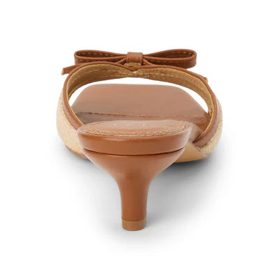 The Porter vegan heeled sandal by Beach by Matisse features warm, cognac faux leather paired with raffia detailing and a sleek kitten heel for versatile, polished styling.