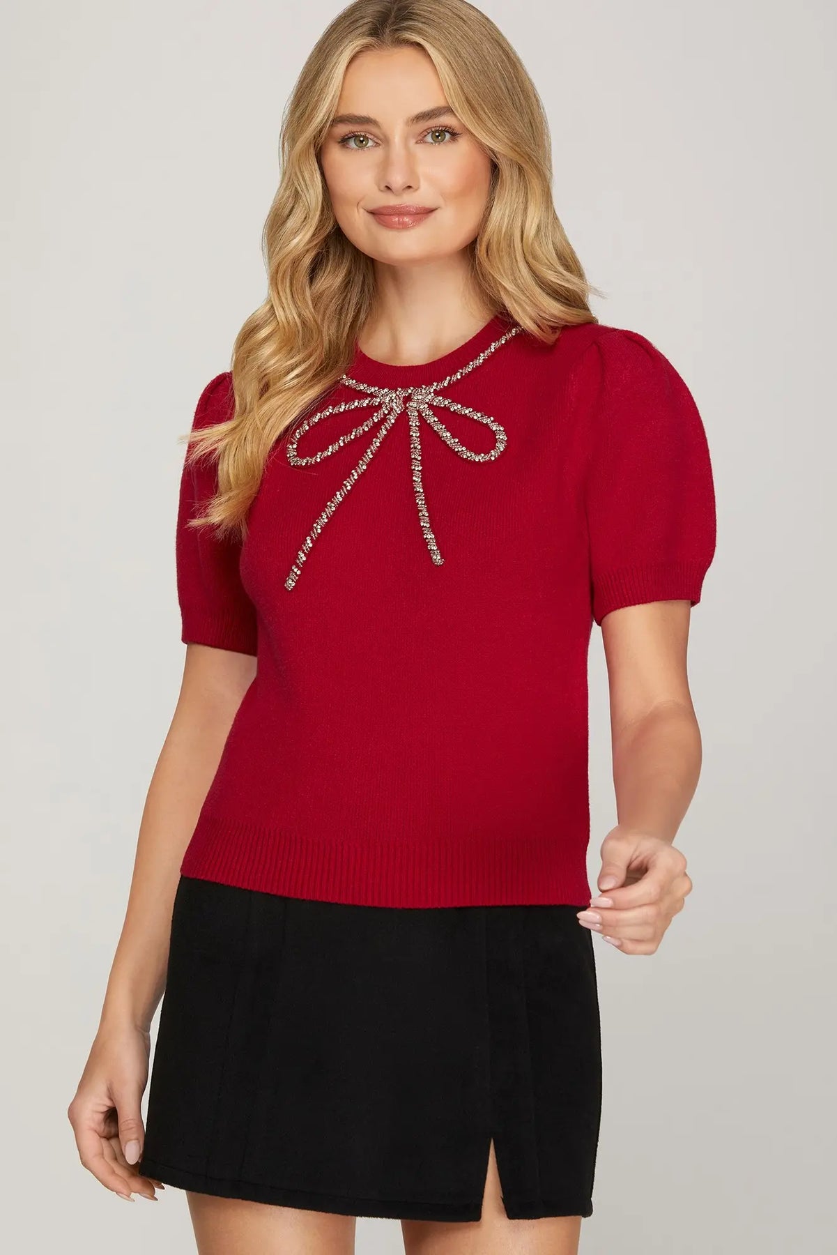 The Classic Bow Sweater: A daring and dazzling addition to your holiday wardrobe. This half sleeve sweater top features a beaded bow that adds a touch of glamour to any outfit. Available in sizes to fit every adventurer, with a model height of 5'8". Take on the season with confidence and style!