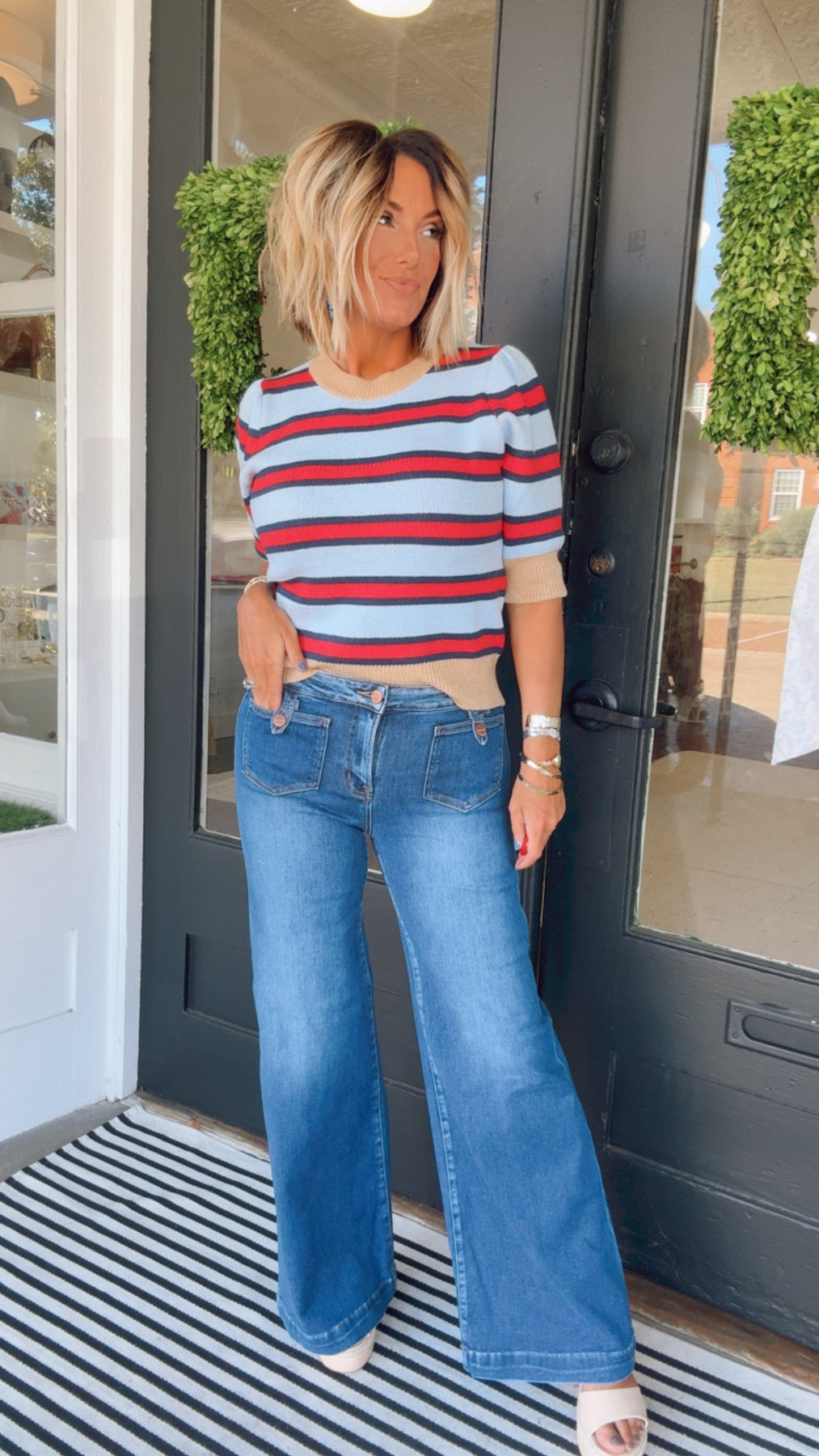 Add some color to your wardrobe with the THML Valley Sweater! This short sleeve striped knit top is the perfect mix of fun and comfort. Stand out from the crowd with this unique sweater.
