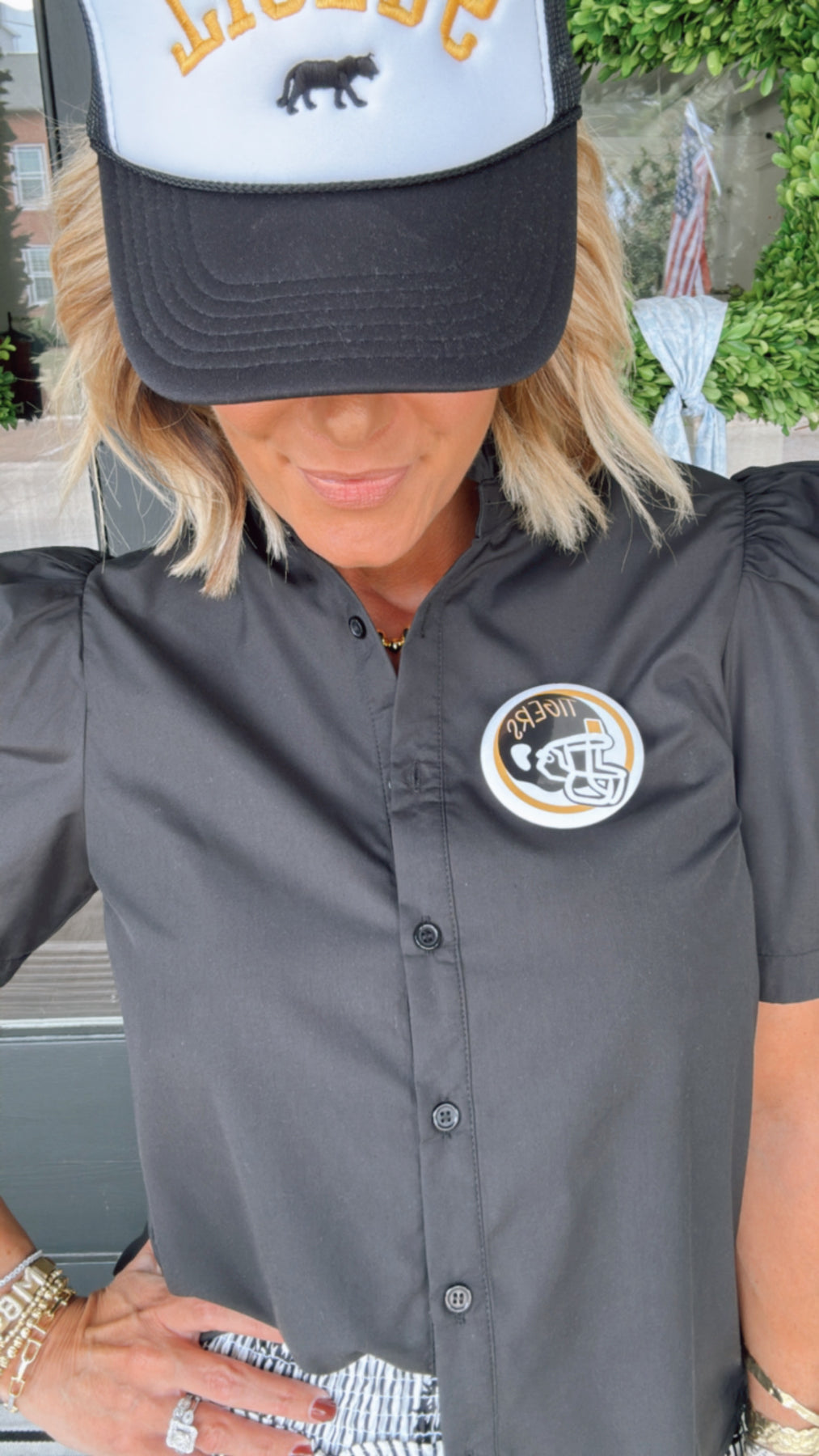 "Upgrade your wardrobe with our stylish Solid Puff Shoulder Top. Featuring a unique ruffle finish band collar and a button front closure, this top is perfect for any occasion. Made with lightweight woven material, it is non-sheer and unlined for ultimate comfort. Get a polished look with this must-have addition to your collection."