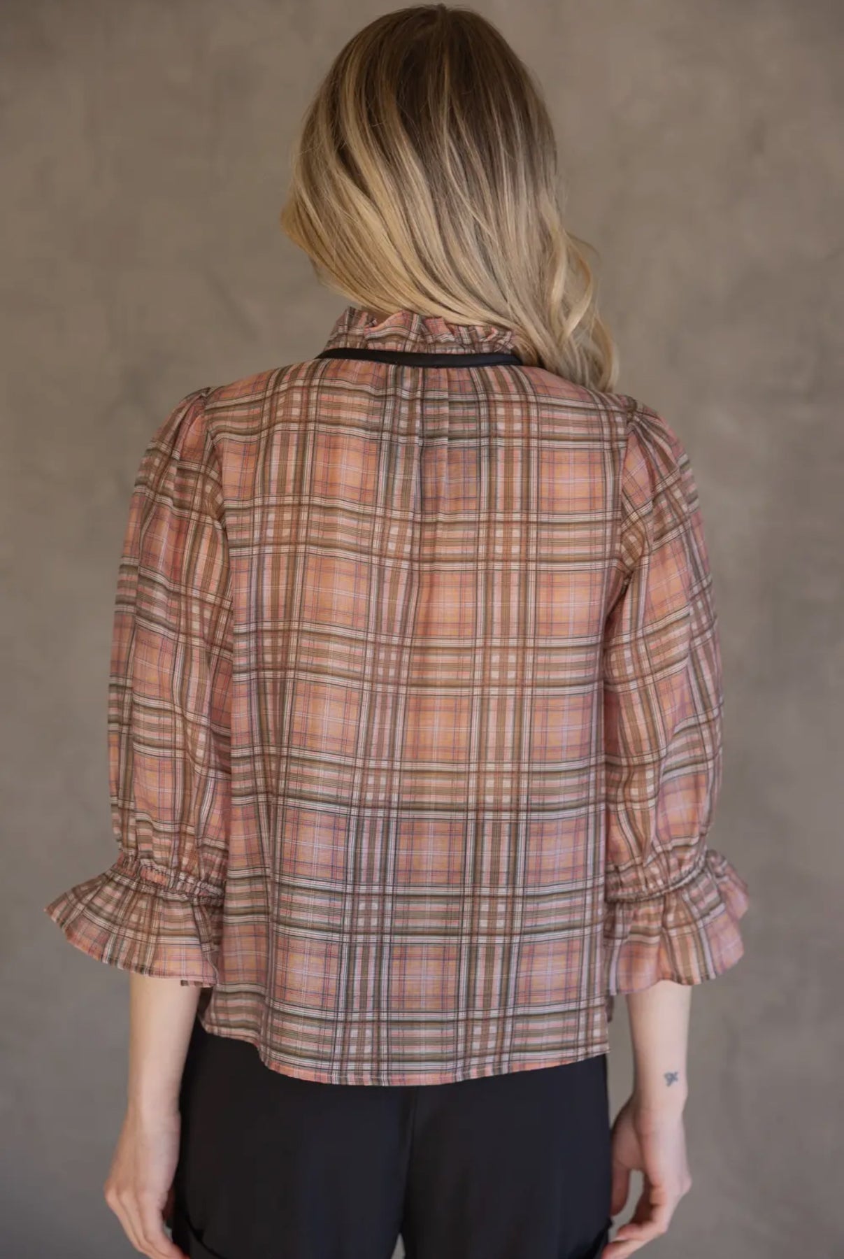 Expertly designed, The Brady Top features a stylish contrast front tie and plaid button down blouse. This chic and modern design adds a touch of sophistication to any outfit. The perfect addition to your wardrobe for a polished and professional look.