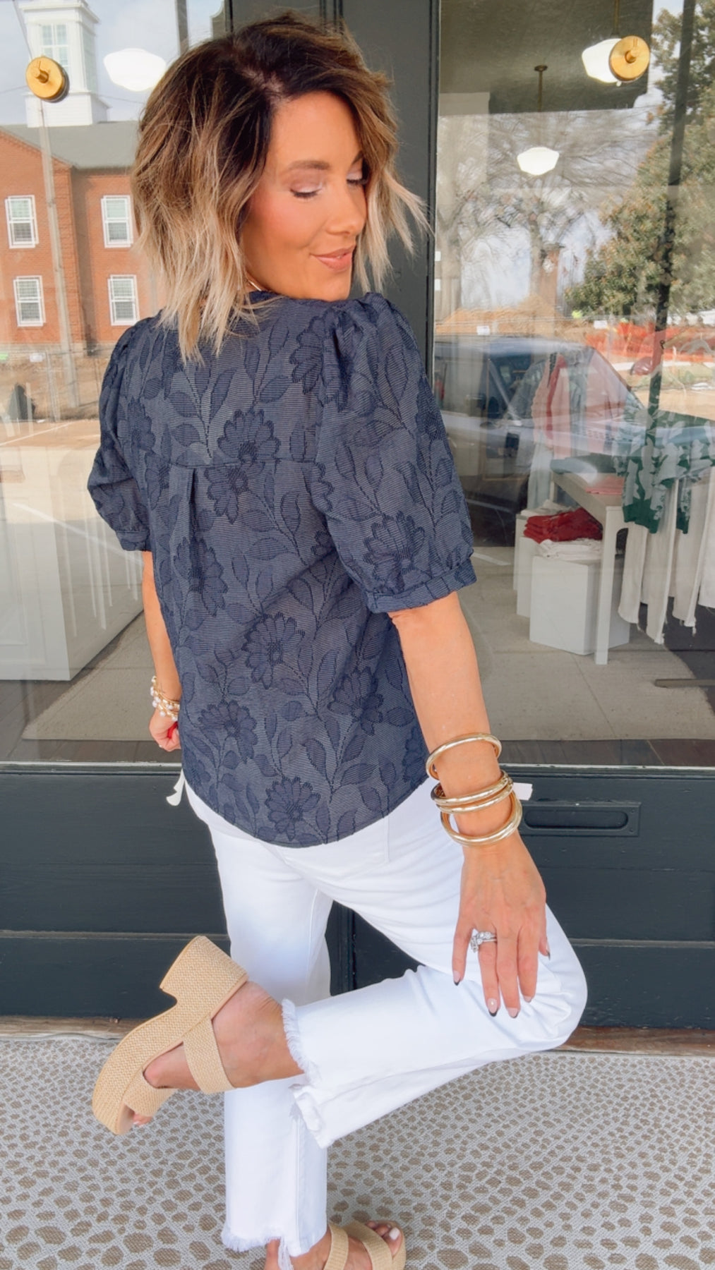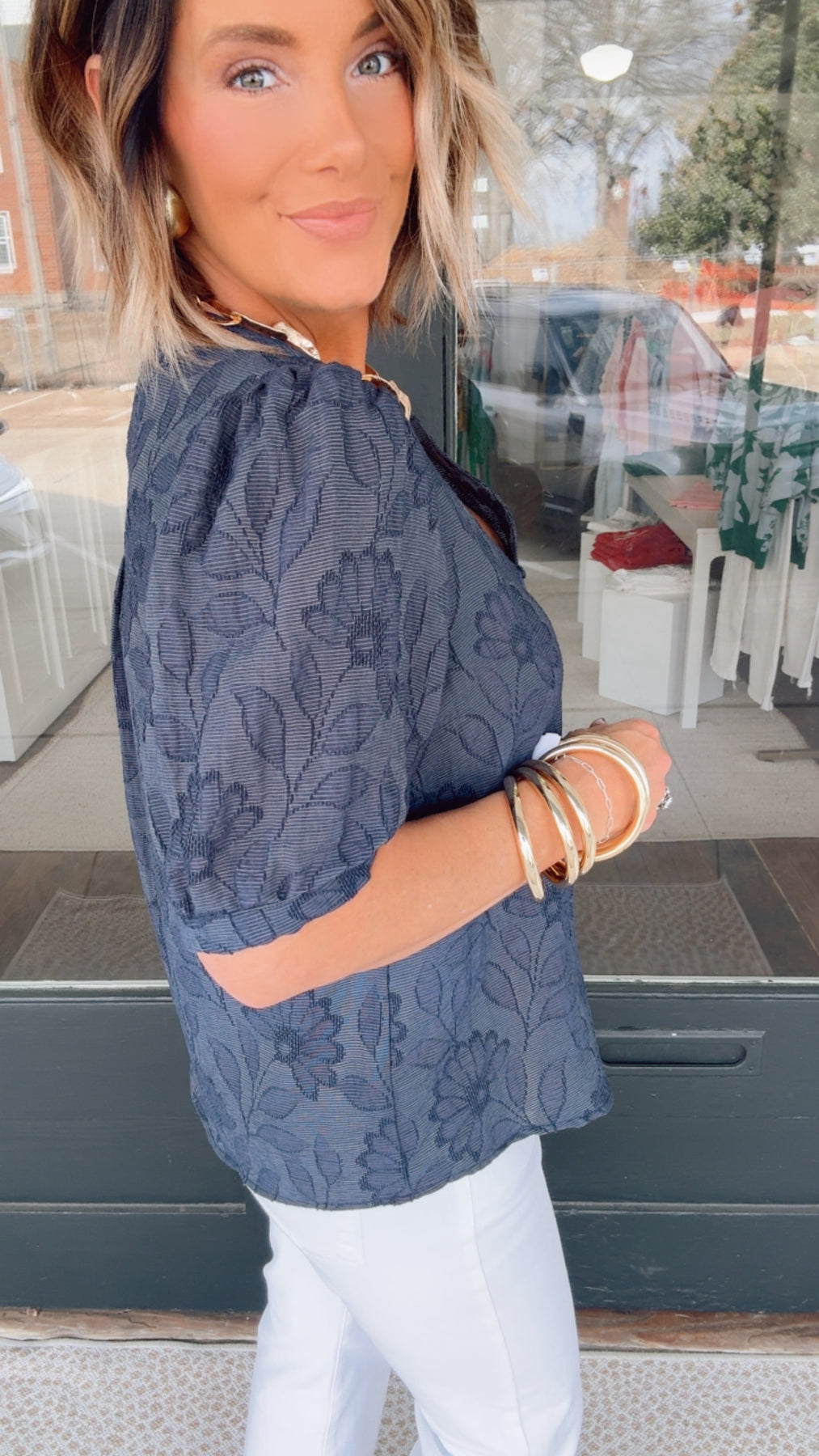 Effortlessly refined, this textured short sleeve top brings understated elegance to your warm-weather wardrobe. The split neckline and voluminous puff sleeves create a polished silhouette, while the button front allows for easy layering and styling versatility. Crafted from lightweight fabric, it's designed for breathable comfort through spring and summer. Perfect for transitioning from casual days to evening occasions with minimal effort.