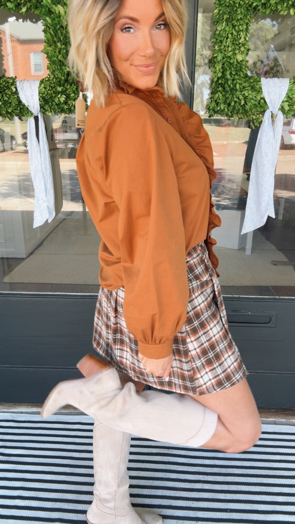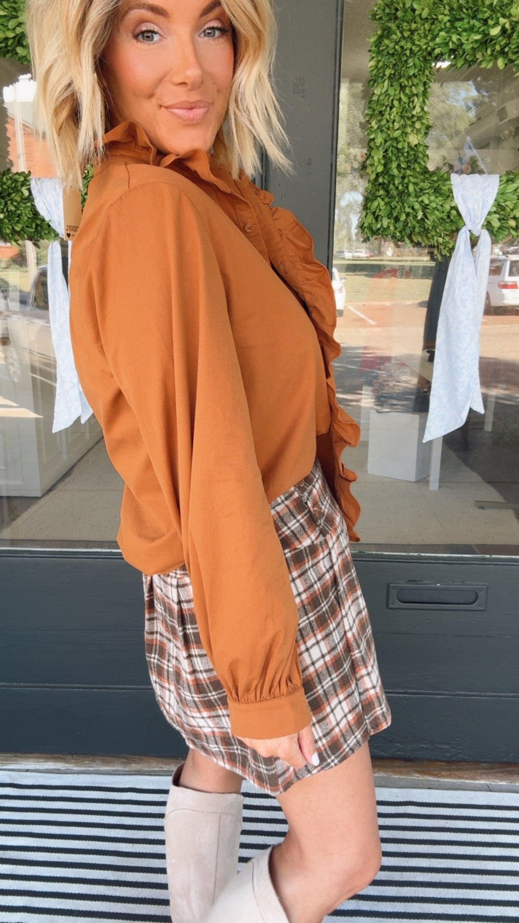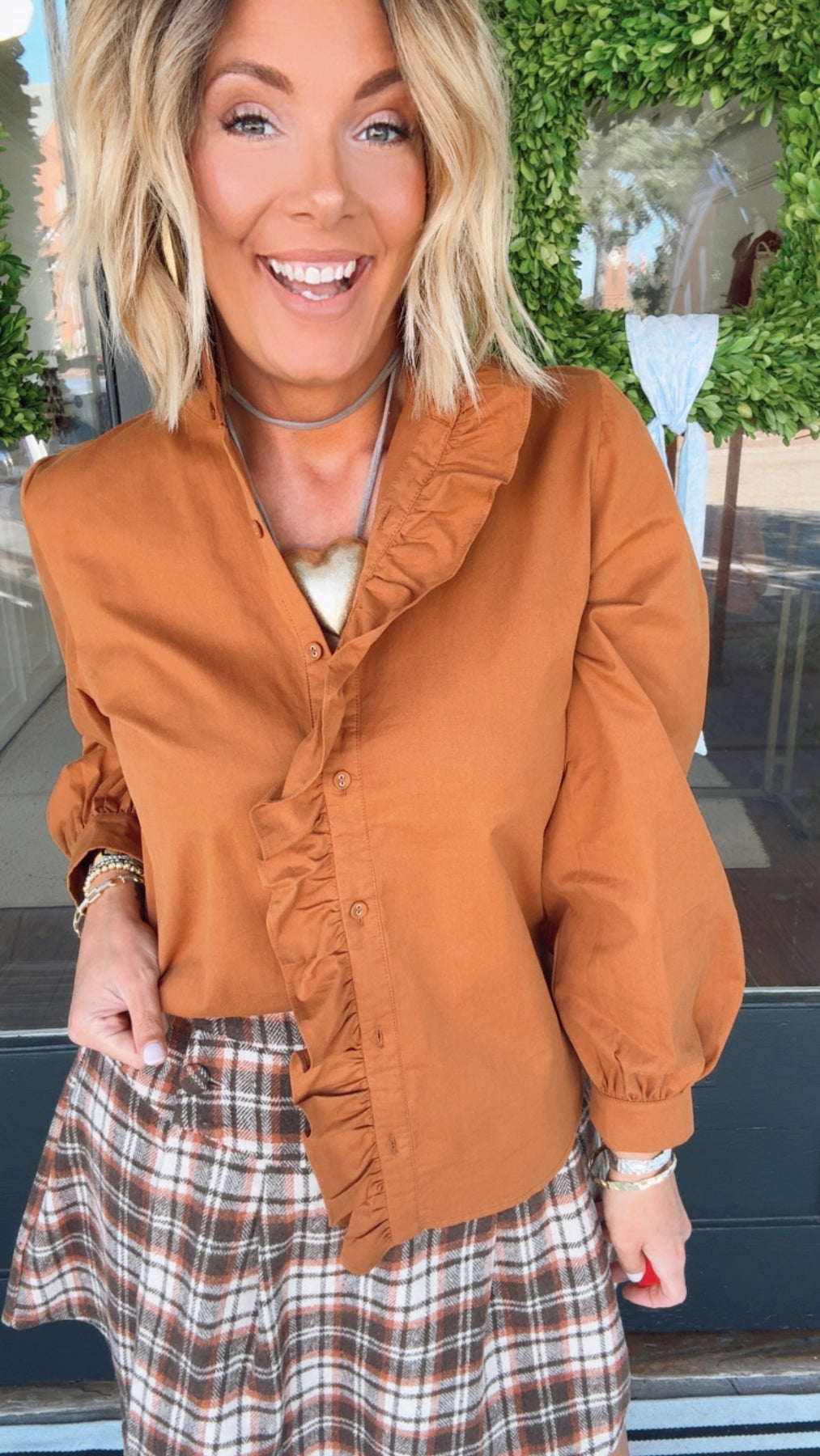 Upgrade your wardrobe with The Delta Top, a must-have for every fashion-forward individual. This long-sleeved button-down shirt features a unique ruffle detail, adding a touch of elegance and style to any outfit. Elevate your look with this trendy piece that is perfect for any occasion. Order now and experience the difference!