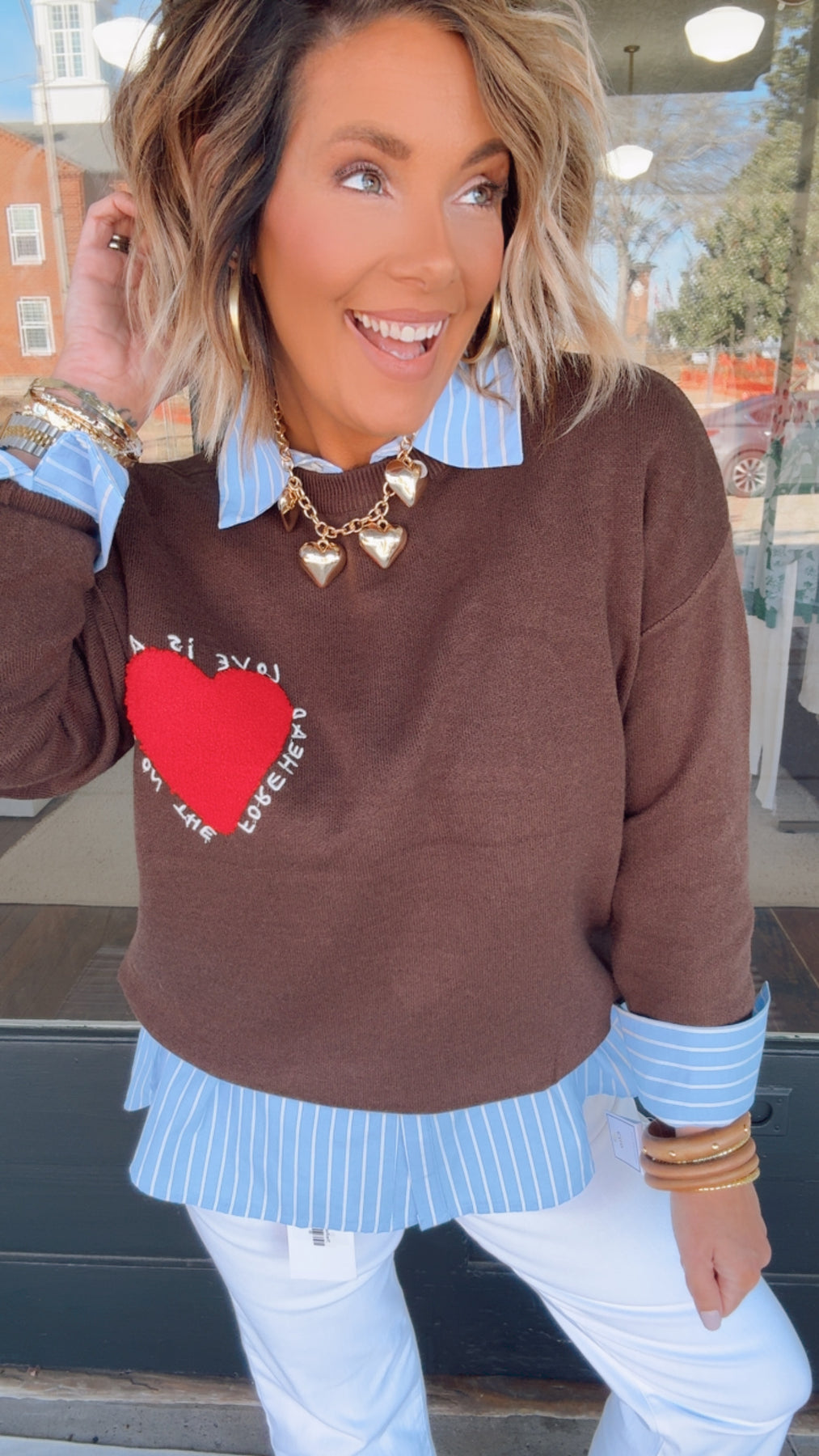 Introducing the Brown Embroidered Heart Sweatshirt a stylish and cozy addition to your wardrobe. Featuring a classic crew neck and long sleeves this sweatshirt is made from soft knitted fabric for all-day comfort. The standout detail is the striking red embroidered textured heart on the chest accompanied by the heartfelt phrase: "Love is a kiss on the forehead." The back showcases a large embroidered red heart that elegantly covers most of the surface making a bold statement. Perfect for layering or wearing on its own this sweatshirt beautifully combines style and meaningful sentiment.