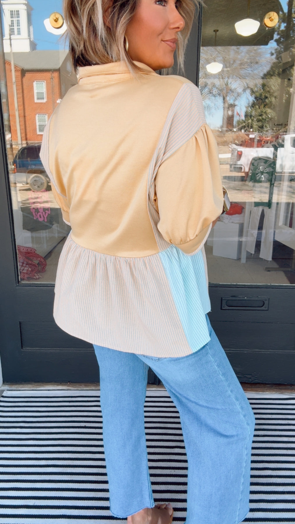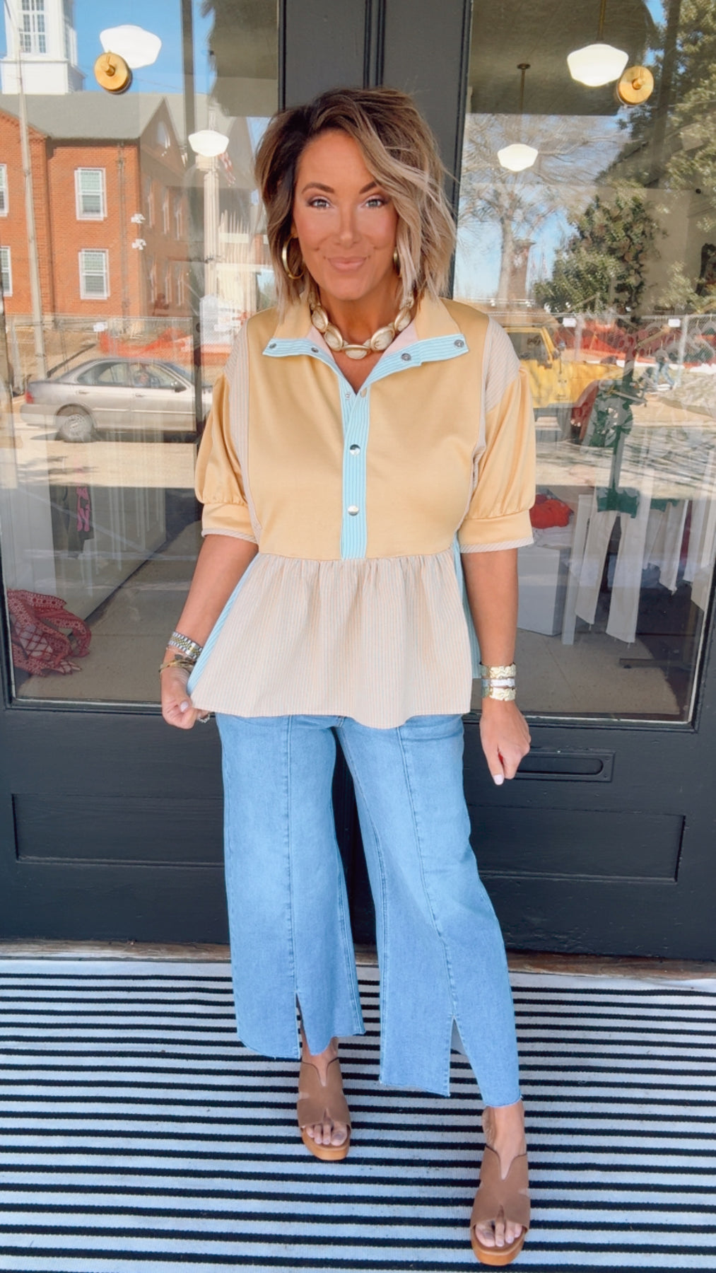 Snap Button Mixed Color Block Peplum Top Mix and match your way to effortless style with this playful peplum top. Bold color blocks create instant visual interest, while functional snap buttons make getting dressed a breeze. The fitted peplum silhouette adds a flirty feminine touch that works equally well dressed up for a night out or paired with your favorite jeans for weekend vibes. A versatile wardrobe essential that brings personality to every outfit.