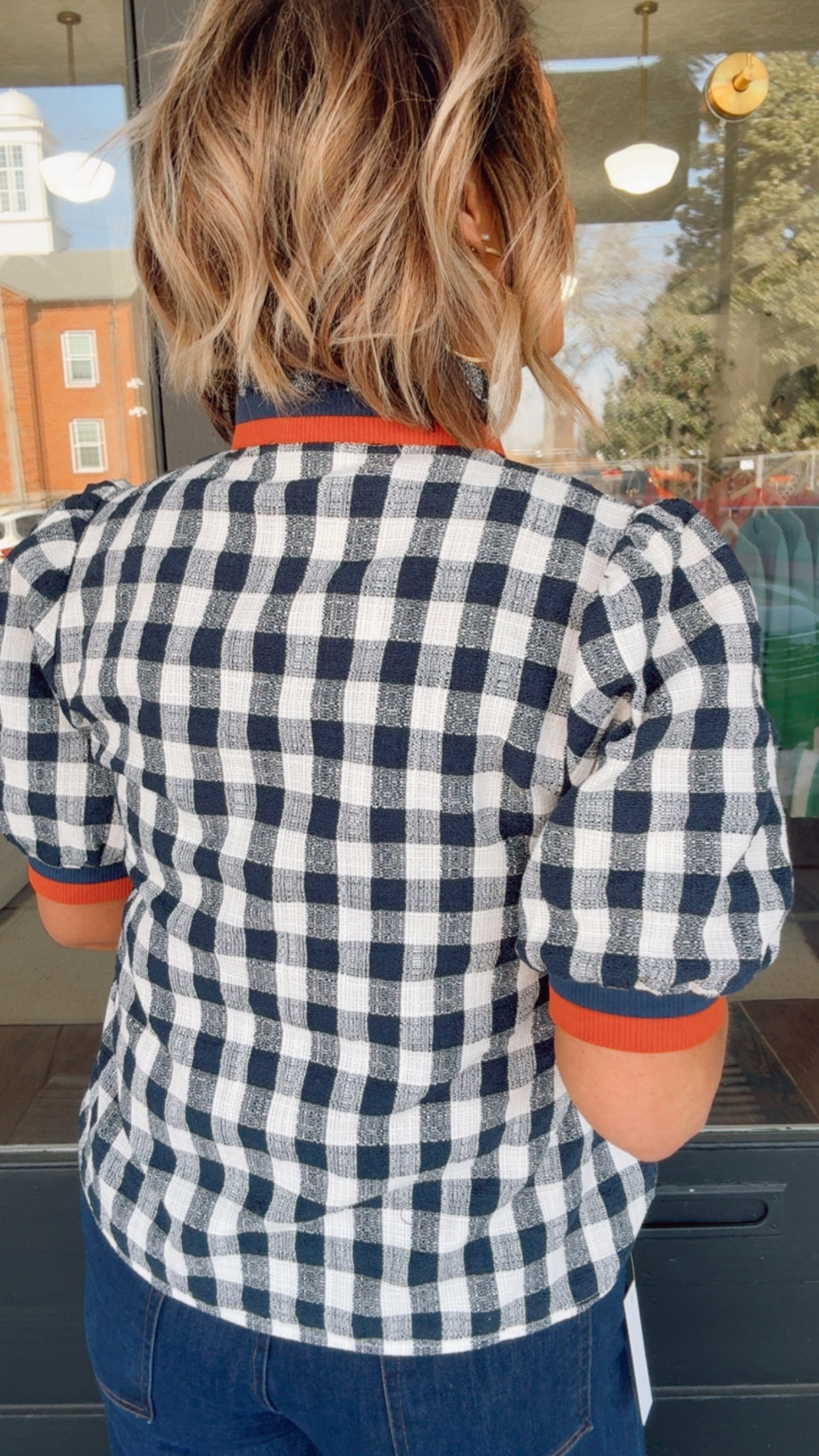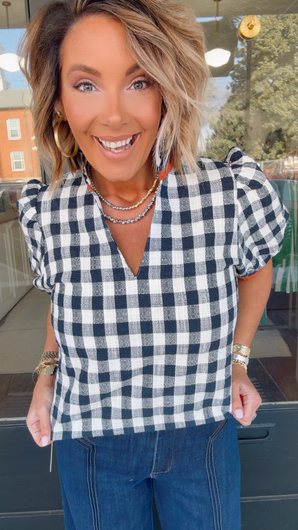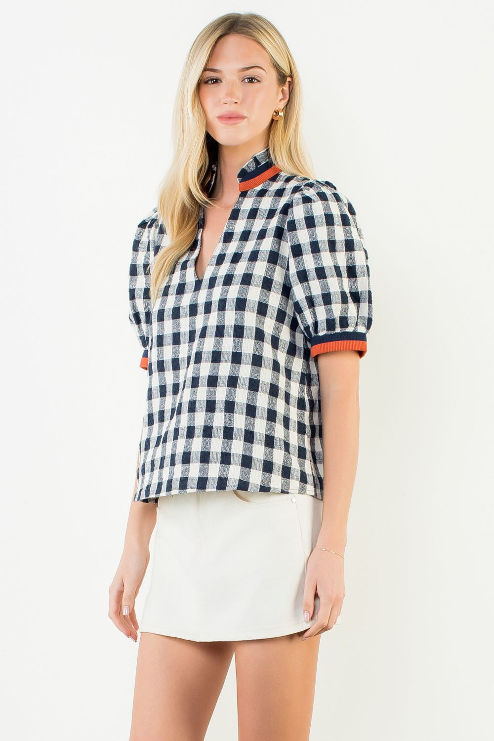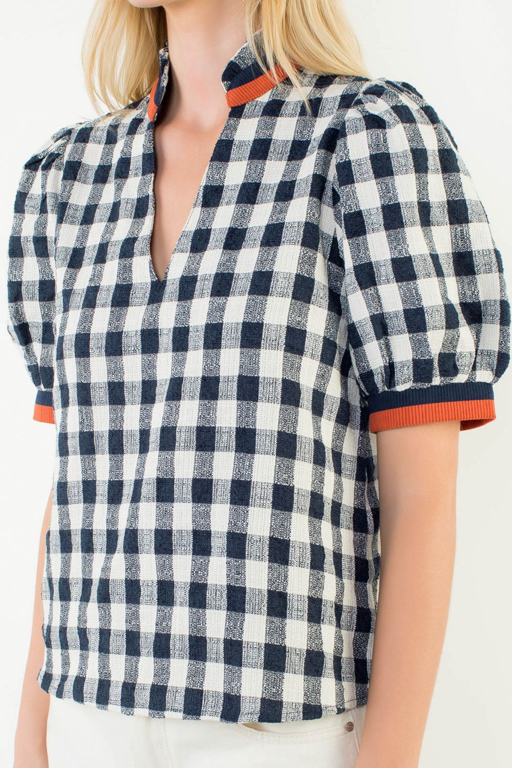 Elevate your everyday wardrobe with this charming checkered V-neck top, designed to turn heads with its flattering puff sleeves and timeless pattern. The structured check print pairs effortlessly with denim or tailored trousers, while the relaxed fit ensures all-day comfort. Perfect for layering or wearing solo, this versatile piece transitions seamlessly from casual weekends to polished weekday looks. A wardrobe essential that delivers both style and wearability.