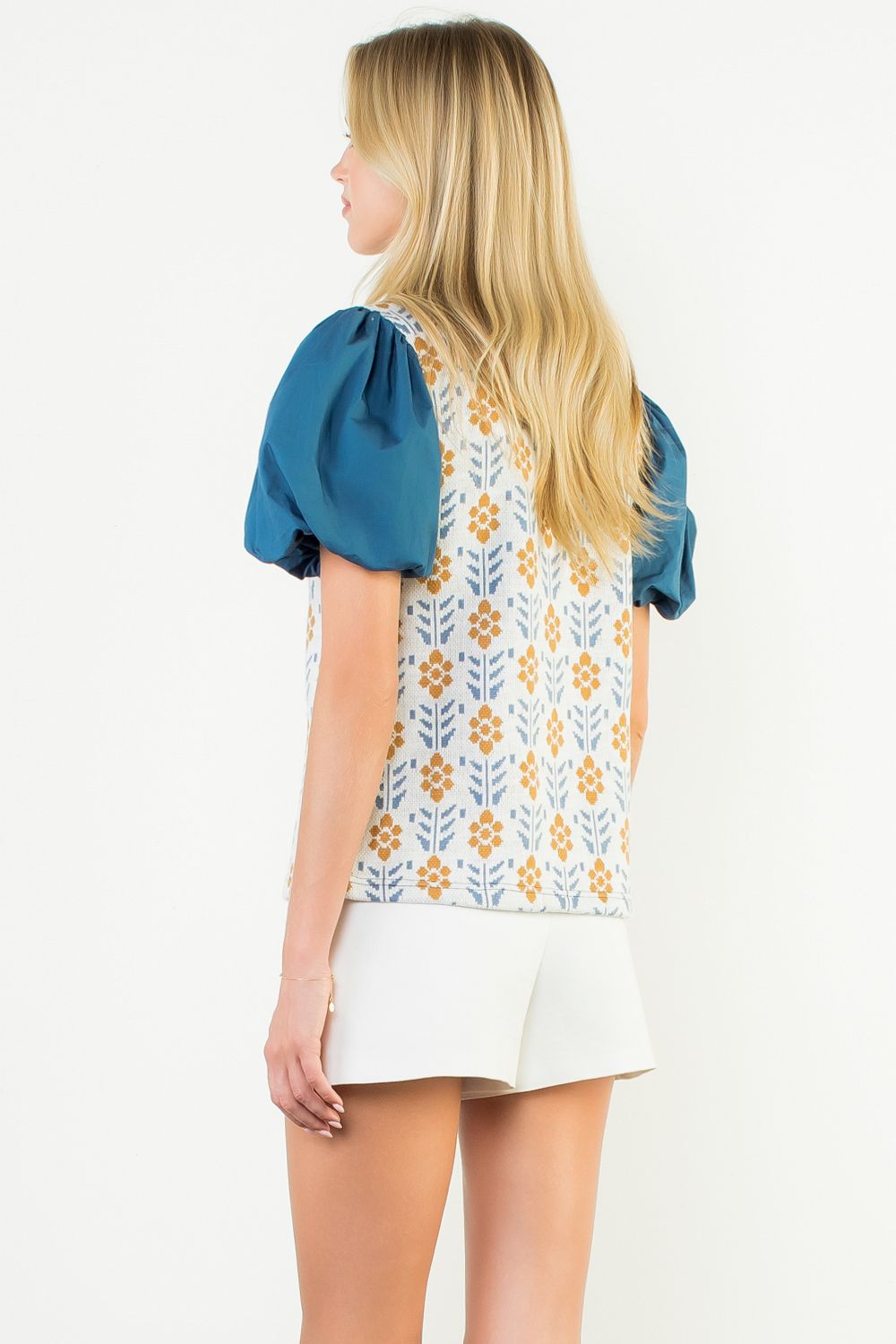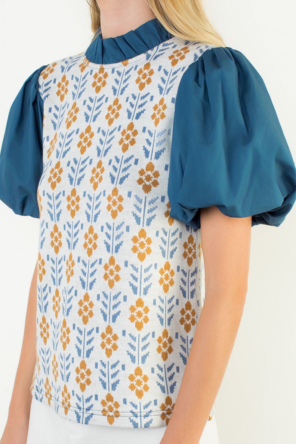 Indulge in luxury with our THML Mixed Media Top. This elegant top features intricate puff sleeves and a beautiful floral pattern, creating a truly sophisticated look. Made with a mix of high-quality materials, you'll feel both comfortable and exclusive. Elevate your wardrobe with this must-have piece.